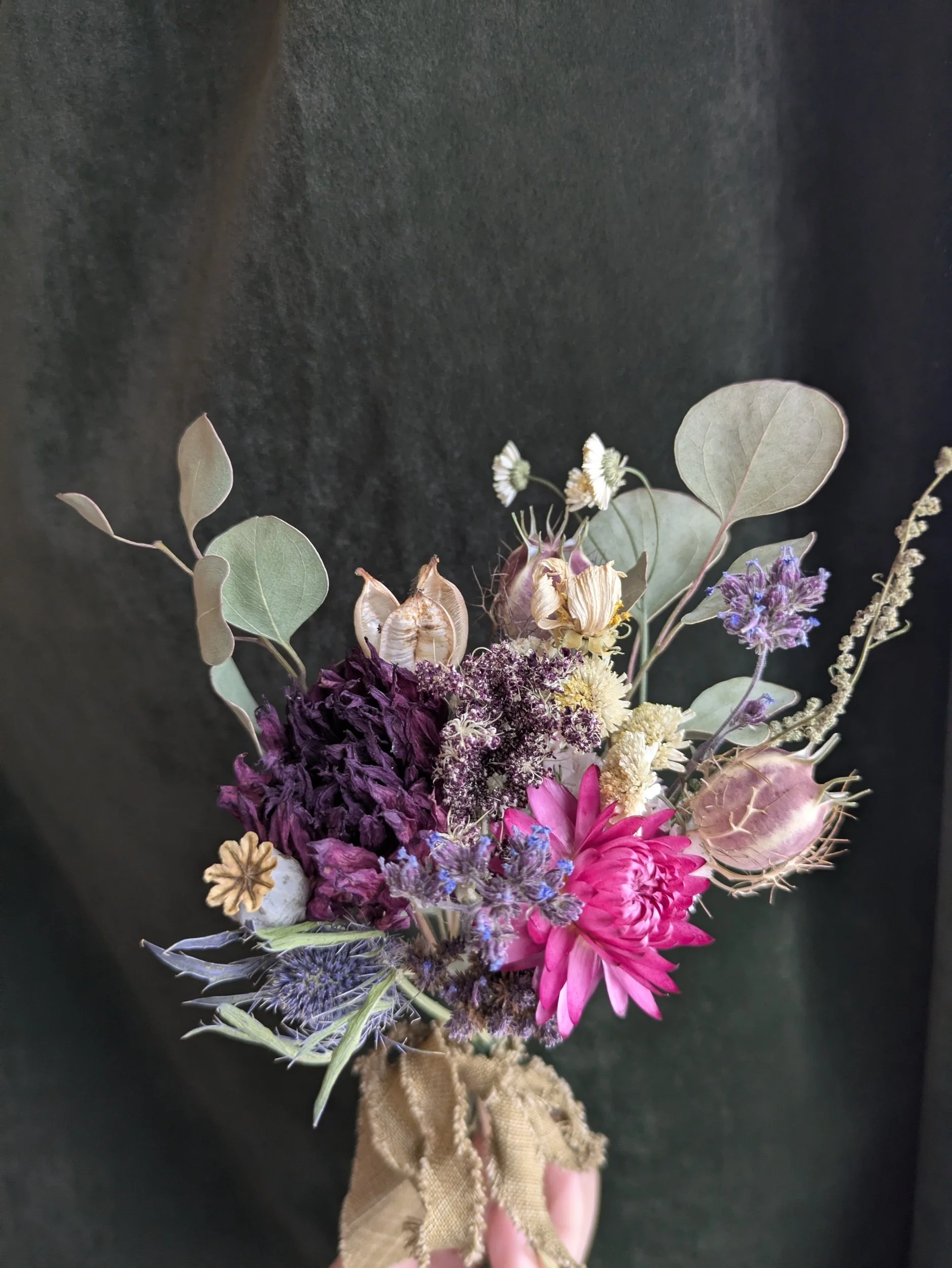 Included in this bouquet: dahlia, verbena, eucalyptus, poppy, strawflower, and more.